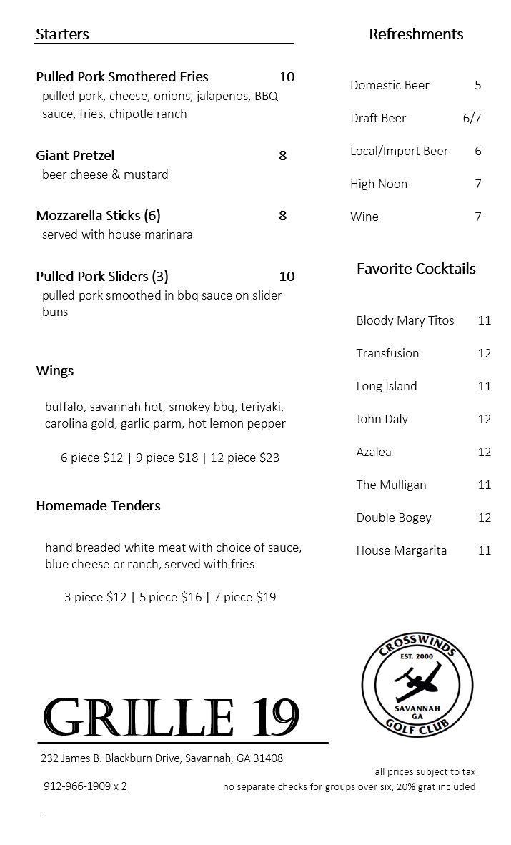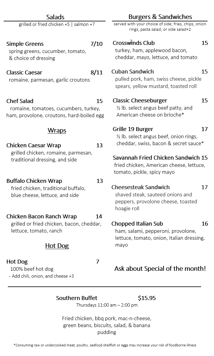Grille 19 located in the clubhouse at Crosswinds Golf Club offers the finest quality menu items to accommodate golfers, corporate guests, and social guests’ food and beverage desires. Open for lunch year-round, the menu changes seasonally and incorporates local market products. Freshly made, unpretentious food is accompanied by daily specials from which you, our special guest, may choose from. A spacious, full bar enhances the large dining room that overlooks our picturesque Par 3 course. Two ample terraces allow for al fresco dining. Large-screen TVs provide dining entertainment so you can relax after a challenging day of golf. If a private space is required, over two thousand square feet adjoins the restaurant to accommodate day and evening events.